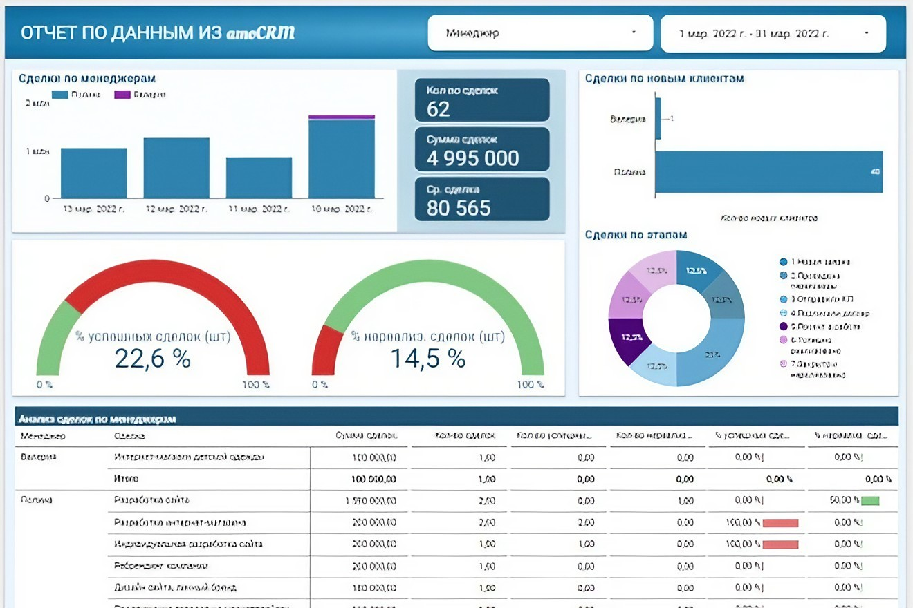 Чтобы управлять продажами на основе данных, мы создаем персональные дашборды и аналитические отчеты. Руководитель видит конверсию по этапам воронки, активность менеджеров и динамику выручки. При необходимости внедряем AI решения для прогнозирования сделок и выявления слабых мест.